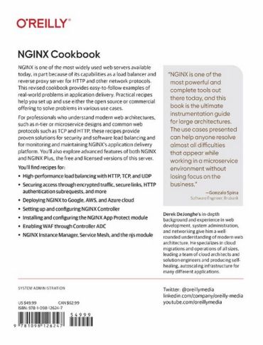NGINX is one of the most widely used web servers available today, in part because of itscapabilities as a load balancer and reverse proxy server for HTTP and other network protocols. This revised cookbook provides easy-to-follow examples of real-world problems in application delivery. Practical recipes help you set up and use either the open source or commercial offering to solve problems in various use cases.