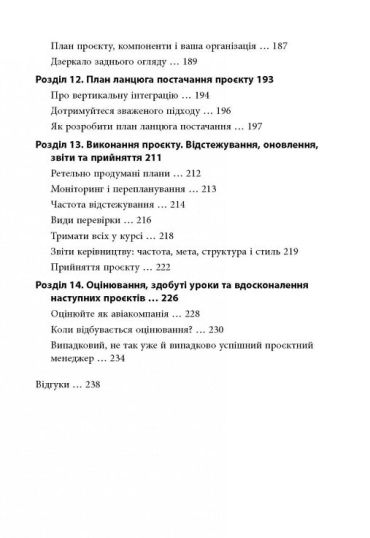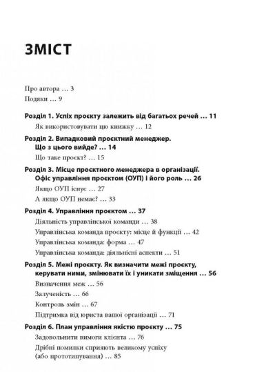 Аби здійснити успішний проект, треба поєднати і врахувати безліч різноманітних факторів. Перед вами книжка, яка допоможе це зробити. Автор розкриває засадничі принципи роботи проектного менеджера, докладно описує особливості різних етапів проекту, дає поради щодо його планування, ведення документації, взаємодії з працівниками, керівництвом організації та сторонніми постачальниками. Простий і цікавий виклад теоретичних понять, зрозумілі схеми, короткі й інформативні підсумки, дотепні життєві приклади… Ці та інші якості роблять цю книжку чудовим путівником, що допоможе вам попри всі перешкоди привести проект до успіху.