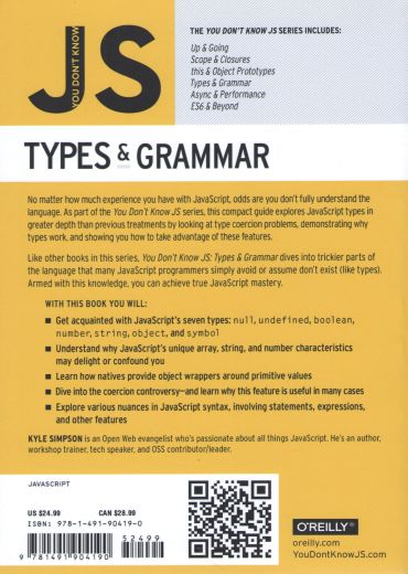 Like other books in this series, You don't Know JS: Types & Grammar dives into trickier parts of the language that many JavaScript programmers simply avoid or assume don't exist (like types). Armed with this knowledge, you can achieve true JavaScript mastery.