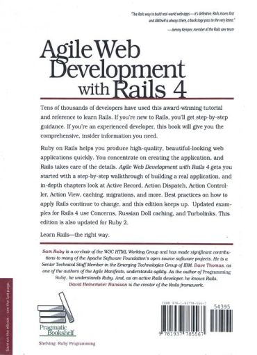 Rails just keeps on changing. Both Rails 3 and 4, as well as Ruby 1.9 and 2.0, bring hundreds of improvements, including new APIs and substantial performance enhancements. The fourth edition of this award-winning classic has been reorganized and refocused so it's more useful than ever before for developers to new Ruby and Rails.