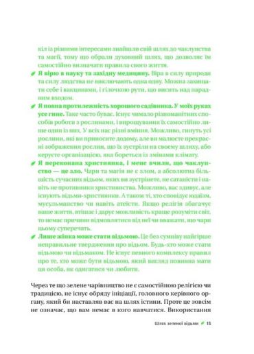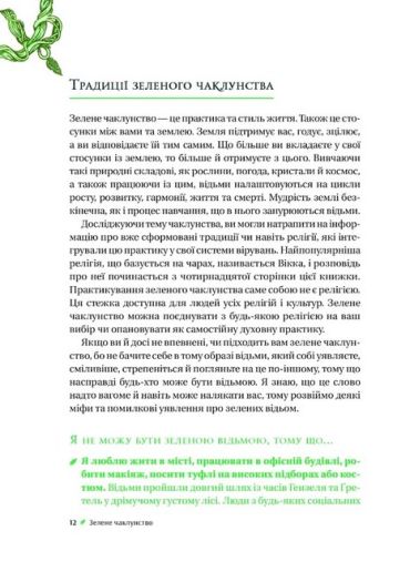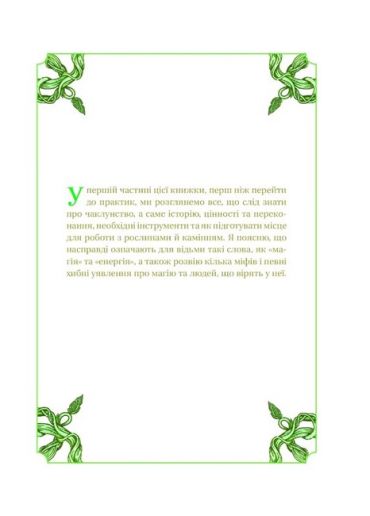 У ваших руках практичний посібник із зеленого чаклунства, який допоможе встановити або посилити зв’язок із рослинами, квітами та камінням. Бо що більше ви віддаєте землі, то більше від неї натомість отримуєте. І вам не треба відмовлятися від своїх принципів і вподобань: віри в науку, медицину, Бога, життя у великому місті чи ділового костюма. Магія — це природна енергія уяви, натхнення та інтуїції, яка живить ваші мрії та прагнення. Тож ваше завдання — навчитися використовувати цю енергію собі на користь. Вам знадобляться кілька перевірених відьомською спільнотою заклинань, кристали, нескладні інструменти та трішки допитливості. І пам’ятайте: будь-хто може стати зеленою відьмою або зеленим відьмаком.