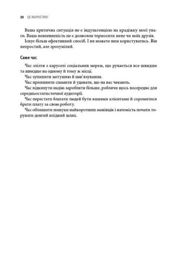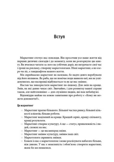 Сет Ґодін навчив і надихнув мільйони підприємців, маркетологів, лідерів і прихильників через свій блог, онлайн-курси, лекції та книги-бестселери. Тепер Ґодін уперше пропонує квінтесенцію своєї маркетингової мудрості в одній компактній і доступній книжці. «Це маркетинг» розповідає, як виконувати роботу, якою ви б пишалися, незалежно від того, чи ви засновник технологічного стартапу, власник малого бізнесу, чи частина великої корпорації.Справжні маркетологи не використовують споживачів для вирішення проблем своєї компанії, вони використовують маркетинг для вирішення проблем інших людей. Їхня тактика ґрунтується на емпатії, зв'язку та емоційній праці, а не на агресивній рекламі й розсилках спаму. Незалежно від того, який у вас продукт чи послуга, ця книга допоможе вам переосмислити те, як ви презентуєте їх світові, щоб налагодити конструктивний зв'язок із людьми, яким вони потрібні.