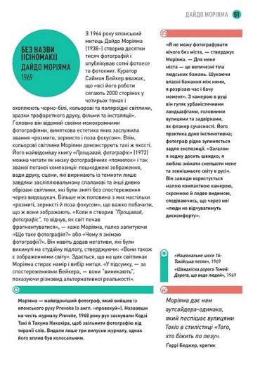 Для чого робити автопортрет, але закривати обличчя лампочкою? Навіщо навмисне недоекспоновувати зображення або фотографувати стелю? І чому це все вважається мистецтвом? У цій книзі Джекі Гіґґінс цікаво та інформативно розповідає про сучасну фотографію. На прикладі 100 ключових фотографів авторка досліджує, що стало натхненням для їхніх робіт, та як саме вони були створені. Джекі Гіґґінс пояснює значення цих унікальних світлин, та чому вони розмиті, переекспоновані або “погано” скомпоновані. Авторка раз і назавжди доводить, що мистецтво фотографії набагато складніше, ніж здається на перший погляд.