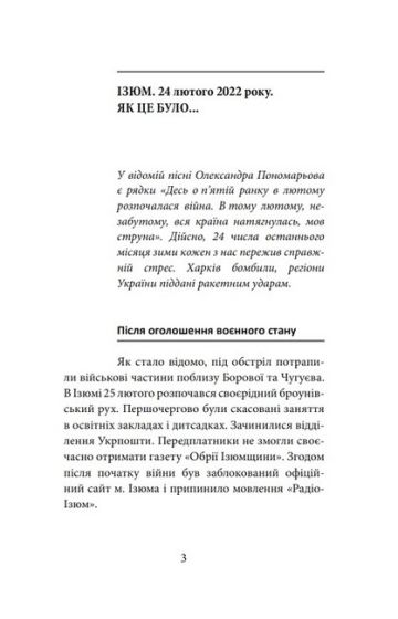 Автор, професійний журналіст, створив хроніку окупації Ізюму 2022 року. Рядок за рядком розгортається реальна історія міста та його мешканців. Читач дізнається про дії місцевої влади у час воєнного стану, проблеми забезпечення життєдіяльності міста, які почалися з перших днів повномасштабного вторгнення, про трагедії людей. Росіяни не могли захопити Ізюм протягом трьох тижнів, що дало нашим військовим час підготувати фортифікаційні оборонні споруди на Схід і на Південний Схід від міста. Після звільнення Ізюму у вересні 2022 року тут знайшли масові поховання і чисельні катівні, які облаштували окупанти. Близько 80% житла в місті було зруйновано.