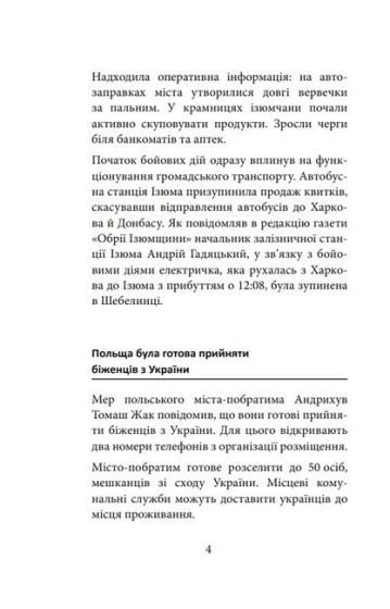У книжці зібрані розповіді очевидців, інтерв’ю з керівниками місцевих органів, газетні статті, дописи з соцмереж, оголошення — документальні свідчення щоденної боротьби за життя в окупованому місті.