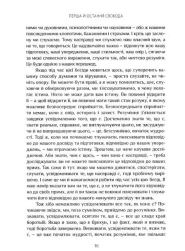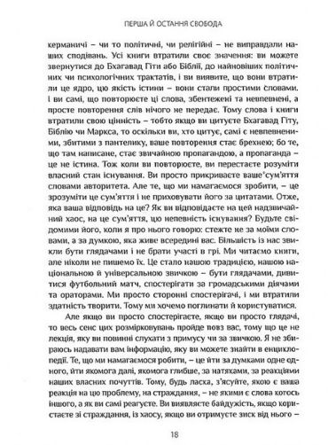Джидду Крішнамурті (1895-1986) – всесвітньовідомий мандрівний наставник, проповідник. Своє завдання вбачав у тому, щоб навчити людей самостійно звільнятися від усіх прив’язаностей: фізичних, психічних і ментальних. Не приєднався до жодної офіційної релігійної організації та філософської школи, вважаючи їх перепонами на шляху до абсолютної свободи. Книга «Перша й остання свобода» охоплює широке коло вічних тем – страждання і страх, секс і плітки, – та лейтмотивом тут постійно звучить провідна концепція свободи.
