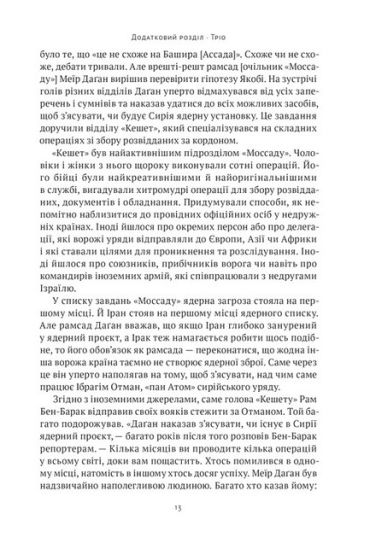 Захопливі розділи книжки розкривають характер і подвиги цих амозонок, від Йоланди при дворі єгипетського короля Фарука до Діни на порозі ядерного сховища Ірану; від Шули, засудженої до страти через повішення, до Сігал, яка завербувала найкращих мусульманських агентів; від Марсель, що вистрибнула з вікна єгипетської камери тортур, до Яель, Ізабель і Даніель, які без тіні сумніву наважились залізти в пащу лева. Лінда дивом вижила під час Голокосту, Аліза розбила скляну стелю, Тріо — три молоді жінки — врятували Ізраїль від страшної небезпеки. І багато інших відважних амазонок виконали дивовижні місії.