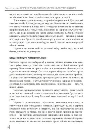 Автор міжнародних бестселерів Томас Еріксон ділиться своїм секретом поводження з нарцисами. Якщо ви втомилися від їхнього постійного вимагання уваги, абсолютної впевненості у своїй правоті, потреби контролювати всіх і все навколо, ця книга допоможе зберегти здоровий глузд. За допомогою чотириколірної поведінкової моделі, відомої з книги «В оточенні ідіотів», Еріксон надає всі необхідні інструменти, щоб справитися не лише з нарцисами навколо вас, а і з нарцисичною поведінкою, яка стає все поширенішою завдяки соціальним мережам. Томас Еріксон допоможе вам зрозуміти, як з ними поводитися, не виснажуючи себе.