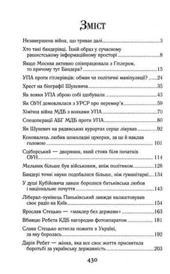 У пропонованому виданні на основі широкої джерельної бази, спогадів українських повстанців і новітніх досліджень національно-визвольного руху 1930–1950-х років відображено маловідомі факти про побут вояків УПА, повстанських командирів та ідеологів українського націоналістичного руху. У ньому читач ознайомиться не стільки з політичним чи військовим життям таких постатей, як С. Бандера, В. Кук, Є. Коновалець, Д. Ребет, Я. Стецько, скільки з їхніми життєвими вподобаннями, захопленнями, рисами характеру, всім тим, що зазвичай залишається поза увагою авторів наукових текстів. Висвітлено й тему протистояння радянських спецслужб із підпільниками ОУН та вояками УПА.