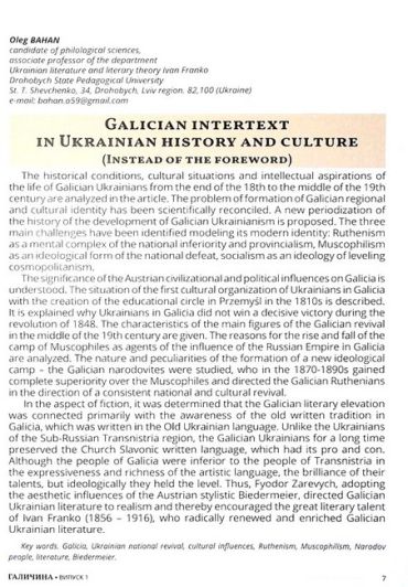Видання присвячене вивченню літературної та культурної історії Галичини як знакового регіону України, який виявився на складному перетині цивілізаційних, культурних й ідеологічних процесів протягом всієї своєї історії. Темою першого випуску є культурна історія українського національного відродження в Галичині періоду між 1848-им і 1870-ми рр. Вивчаються проблеми становлення й розвитку українськомовної преси в Галичині, діяльність і творчість ключових постатей галицької культури, тодішні літературні тенденції, історичні умови та інтелектуальні інтенції.