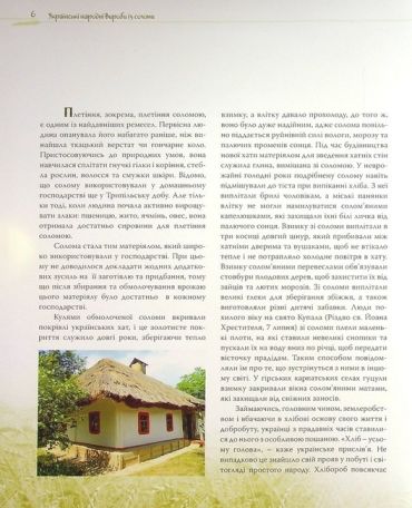 "Українські народні вироби із соломи" - це своєрідний посібник, за яким можна навчитися виготовляти прикраси, атрибути до свят, елементи інтер'єру, предмети вжитку. Авторка книжки також проводить екскурс в історію українського соломоплетіння, розповідає про вироби, які споконвіку були присутні у побуті наших предків. Книжка для всіх, хто цікавиться цим давнім ремеслом.