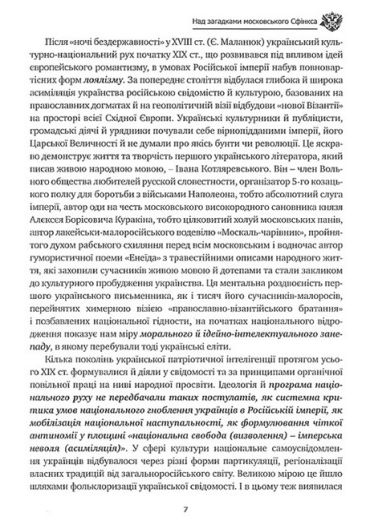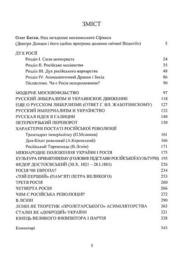 Дмитро Донцов був першим украінським політичним мислителем та ідеологом, якии розпочав цілісну критику росіиськоі цивілізаціі і ментальності як глобальних загроз для Украіни і Європи. Иого публікаціі перед 1-ю Світовою віиною на цю тему підштовхнули украінців до переосмислення 200-річного союзу двох православних народів і виявлення правдивих причин глибинного розходження між ними. Збірку склали головні праці автора на росіиську тематику переважно першого періоду иого творчості 1910 – 1930-х рр., коли він зумів пояснити наивиразніші ознаки росіиського імперіалізму, культури та менталітету. Студія «Дух Росіі», хоч і була видана у 1961 р. німецькою мовою, проте цілком передає концептуалістику ранніх виступів Д. Донцова. Видання рекомендується для політологів, філософів, культурологів, літературознавців та всіх, зацікавлених у проблематиці глобальних віин та протистоянь між цивілізаціями.