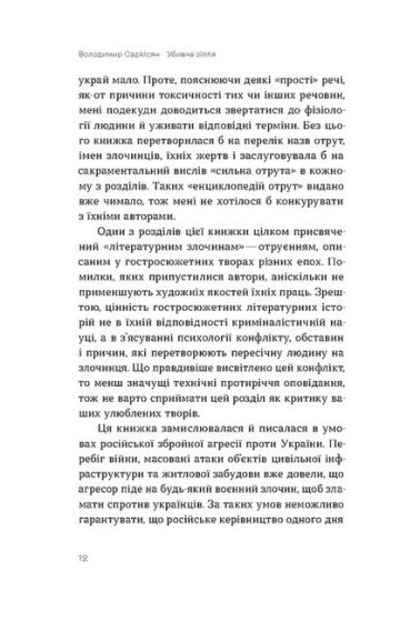 Автор занурюється у відомі детективні тексти та поліцейські хроніки, препарує реальні й вигадані отрути, пояснюючи механізм їхньої дії. Від жертв славнозвісної міледі з романів Дюма до постраждалих від звичайної солі. Фронти Першої світової війни, атака в токійському метро, бойові отрути і масові самогубства – про все це розповідає хімік Володимир Саркісян.