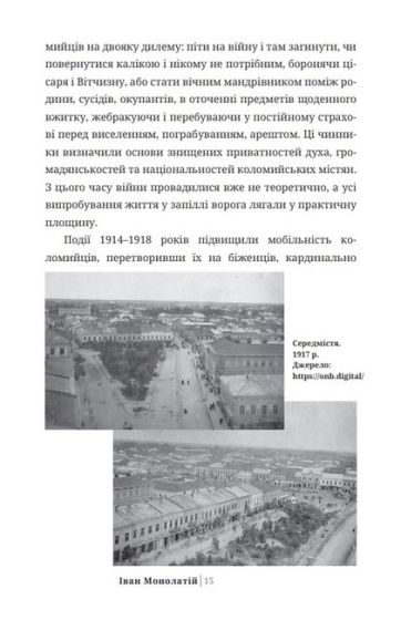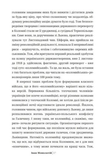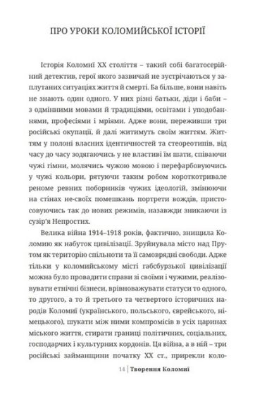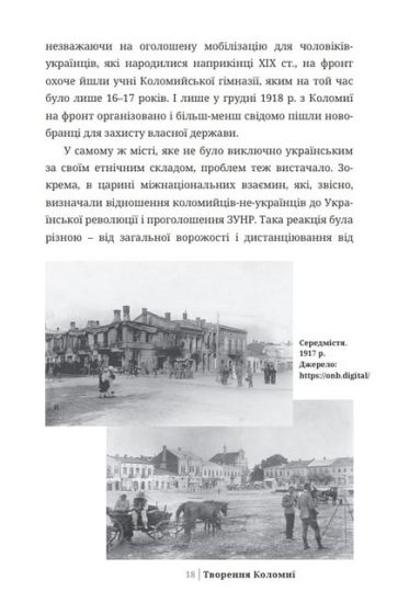 У виданні проаналізовано найголовніші державотворчі процеси у Коломиї в період становлення та існування західноукраїнської державности 1918–1919 рр. (ЗУНР–ЗоУНР). У цей час Коломия була одним із найважливіших економічних і політичних центрів на Галичині. Містові над Прутом судилося відіграти вагому роль у розбудові політичних інститутів новоствореної національної держави, а значні ресурси міста були задіяні і в українсько-польській війні, що розпочалася одразу із проголошенням ЗУНР. Бойові дії хоч і загострили українсько-польський антагонізм у місті, все ж комунікація між обома етнічними групами відбувалася в межах правового поля та відносно толерантного ставлення один до одного. Активно розвивалися місцеве самоврядування, громадські інституції, волонтерський рух, театр, освітні заклади. Коломия набувала рис українського міста, витворилася його українська ідентичність, яка досі впливає на життя коломийців.