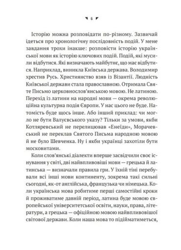 • Драматична історія буває не лише в людей, а й у мов. Дізнайтеся, як боролися за виживання українська мова та її носії протягом століть — ця книжка складе вам компанію і стане чудовим путівником у хроніку її буремного шляху.