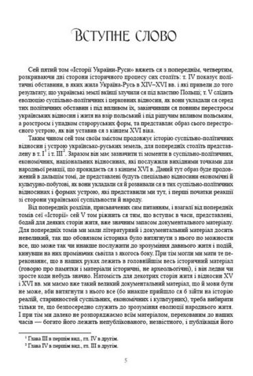 У п’ятому томі подається загальний огляд суспільно-політичної еволюції українських земель у XIV–XVII столітті, розглянуто станові групи населення (шляхта і магнати, селянство, міщанство, духовенство), історія місцевого та церковного врядування, виникнення уніатської церкви.