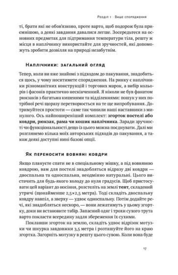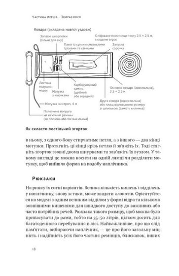 Усередині ви також знайдете детальну інформацію про таке: 5 найважливіших речей для виживання, виготовлення потрібних інструментів і витратних матеріалів, збір і приготування їжі, захист від стихії.
