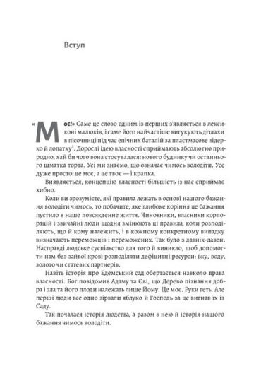 - Розповідає про власність з кількох різних точок зору: економічної, соціальної, політичної, культурної, юридичної, психологічної. Тому читати її досить цікаво, щоб отримати повну картину уявлень про поняття власності.