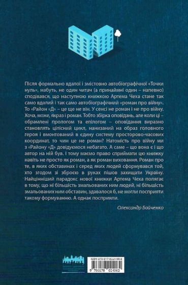 «Район «Д» – збірка об’єднаних спільним часом і простором історій, з яких поступово вимальовується портрет автора на тлі «інших берегів», де минули його дитинство, отроцтво і юність. Самокритичний портрет, у якому можна розгледіти риси хуторянства і космополітизму, дріб’язковості й великодушності та ще багато чого. Водночас це груповий портрет кількох десятків більш або менш прописаних мешканців згаданого черкаського району з їхніми більш або менш успішними спробами пережити несподіваний перехід від пізньорадянської до ранньонезалежної України.