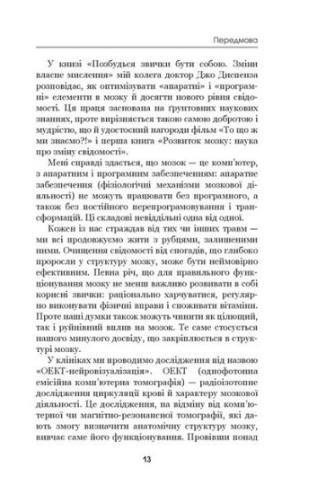 Мабуть, кожна людина в якийсь момент із жахом усвідомлює, що втратила здатність радіти. Відчувати радість щодня, щохвилини, щосекунди, тобто плекати в собі це почуття, незалежно від зовнішніх обставин. І тепер, щоб почуватися щасливою, доводиться заповнювати пустку всередині придбанням нової автівки, нових меблів, нового будинку тощо. Але ж це не має тривалого ефекту. До того ж, зізнаймося собі, ми витрачаємо безліч сил на те, щоб вдавати із себе людину, яку, на нашу думку, сприйме суспільство. Як змінити своє життя, як зробити так, щоб не залежати від середовища, а бути по-справжньому успішним, щасливим і жити у злагоді зі своїм Я? Відповіді на ці запитання ви знайдете у книзі, яку тримаєте в руках. Її автор Джо Диспенза — знаний дослідник, спеціаліст із хіропрактики — розповість про особливості людського мозку і підсвідомості й навчить, як перепрограмувати свідомість і досягти докорінних змін у житті.