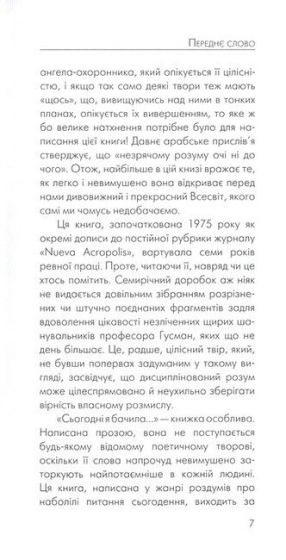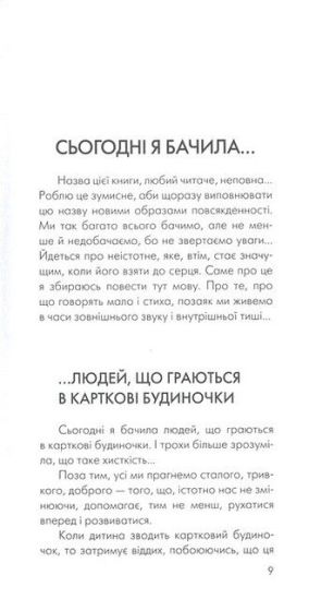 "Сьогодні я бачила..." — книжка особлива. Написана прозою, вона не поступається будь-якому відомому поетичному творові, оскільки її слова напрочуд невимушено заторкують найпотаємніше в кожній людині. Ця книга, написана у жанрі роздумів про наболілі питання сьогодення, виходить за межі часу і простору, в яких ми живемо, бо жоден її фрагмент не можна назвати відголосом скороминущих уподобань, що так само легко зникають, як і виникають. Отже, перед нами одна з тих незвичайних книг, обкладинка якої мало, а то й нічого нам не говорить, але під нею пульсує цілий світ, геть відмінний від нашого — охмареного песимізмом та безликістю; цілий світ, що, діючи як живодайний бальзам, стає одою життю у кожній з його незліченних форм.