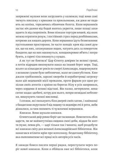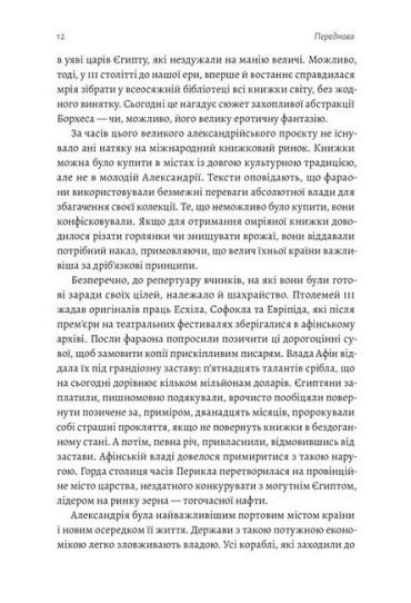 Вона знайомить із маловідомими особистостями, які зіграли свою роль у розвитку книжкової справи — учителями, оповідачами, книгарями, перекладачами, рабами і бунтарями. Це повна історія одного із найважливіших засобів передачі знань, який і досі відчайдушно бореться за своє існування.