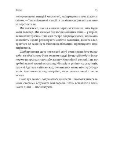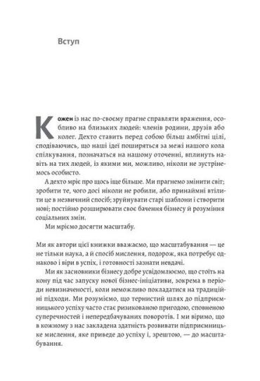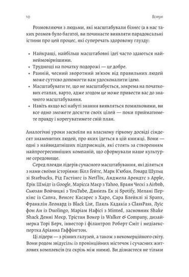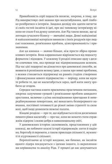 У ній вміщені інтерв'ю із лідерами знакових компаній, включаючи Apple, Nike, Netflix, Spotify, Starbucks, Google, Instagram і Microsoft, а також з тими підприємцями, які тільки розпочинають свій шлях, але вже встигли гучно заявити про себе сміливими стартапами — 23andMe, TaskRabbit, Black List і Walker&Co. Додаючи до цього власний досвід засновника та інвестора, Рід Гофман створює унікальний посібник, який надихне вас переосмислити власну справу.Завдяки захопливому сторітелінгу та глибокому аналізу книжка «Майстри масштабування» розвінчує найпоширеніші міфи про бізнес та ділиться дивовижними істинами, дотримуючись яких можна створити унікальний продукт, який зробить світ кращим.