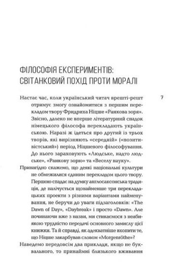 У творчому спадку Фридриха Ніцше «Ранкова зоря» – друга з трьох праць, що вирізняють середній («позитивістський») період філософування німецького мислителя. Посідаючи позицію між «Людським, надто людським» і «Веселою наукою», вона знаменує початок майбутнього проекту «переоцінки всіх цінностей». Текст складається з п’яти частин, які містять 575 афоризмів різної довжини й тематики. Ніцше визначає мораль як звичаєвий спосіб учинку й оцінювання. Порушено питання про передсуди, вільнодумство, проблеми істини та знання. Проведено підготовчу роботу з подальшого вивчення моралі та релігії, що розвиватиметься в полемічному трактаті «До генеалогії моралі» та критичній розвідці «Антихрист». В «Ранковій зорі» філософія Ніцше розглядається як експериментальна візія існування й випробування різноманітних перспектив самореалізації людини. Видання супроводжується історико-філософською передмовою й дослідницько-термінологічним коментарем.