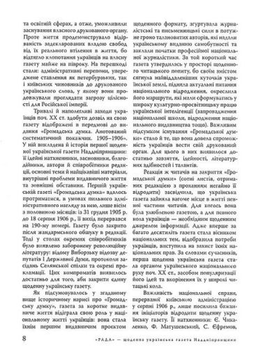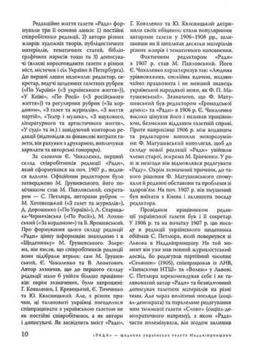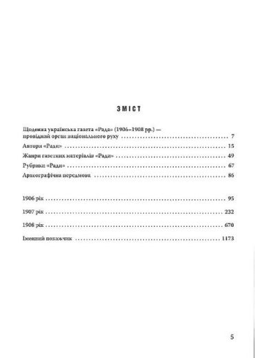 У довіднику презентовані матеріали щоденної української газети «Рада» за 1906-1908 роки. Вони розташовані за тематично-хронологічним принципом і охоплюють усі газетні рубрики, зокрема й рекламні оповістки та оголошення й найдрібніші замітки. У виданні відображені як авторські матеріали різних жанрів (статті, тематичні цикли, художні твори, кореспонденції, дописи, повідомлення, нариси), так і редакційні (передові статті, рубрики). Автори, не зазначені на шпальтах «Ради», встановлені упорядницями за її редакційним примірником. Усього виявлено кілька десятків таких невідомих авторських імен. Матеріали довідника відображають тематичну різновекторність української газети, історію її формування як національного видання із самобутніми темами, сюжетами, героями, рубриками тощо. За покажчиком можна простежити співпрацю з «Радою» потужної плеяди українських журналістів, які своїми талановитими, сміливими й самостійними дописами, кореспонденціями та статтями закладали основи національної журналістики.