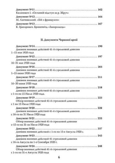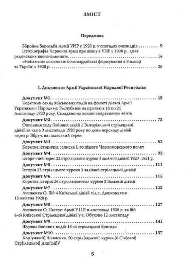 Книжка присвячена бойовим діям Армії Української Народної Республіки та її союзників проти військ Радянської Росії у травні–листопаді 1920 р. У книжці опубліковано 13 документів та 10 кольорових схем з українських архівів (ЦДАВОУ), 26 документів та 9 кольорових схем, які зберігаються в архівах Російської Федерації (РГВА, ГАРФ), а також 1 рукопис із приватної колекції. Усі документи публікуються вперше та в повному обсязі розкривають зміст бойових операцій і характер збройного протистояння поміж українськими, радянськими, польськими та білогвардійськими збройними формуваннями. Більшість документів Армії УНР становлять історичні нариси та хроніки військових частин, а також кілька аналітичних матеріалів, написаних по «гарячих слідах». Радянські джерела — це журнали бойових дій 41-ї та 60-ї стрілецьких дивізій, які були основними супротивниками Армії УНР. Нарешті білогвардійські матеріали — це два розлогих спогади, а також документи зі статистичними даними. Видання приурочено до 100-ї річниці боїв за незалежність України у 1920 р.