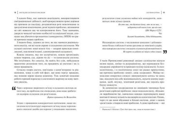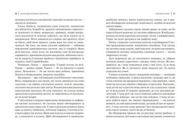 Наш світ — грандіозна система, яка щодня складнішає та кидає нові непрості виклики. Війни, голод, бідність чи критичний стан екосистеми — усе це не просто катаклізми, а системні збої великої обчислювальної машини реального світу. Послідовний системний підхід — єдина зброя проти загрозливих для обмеженого мислення обставин. Донелла Медовз переконана: саме системне мислення є інструментом розв’язання особистісних і глобальних проблем. Спорт, наука, бізнес, політика тощо — розуміння процесів та алгоритмів систем дає змогу бути на коні в будь-якій сфері діяльності. Час розвинути в собі навички, які лідери по всьому світі вважають наріжним каменем виживання в