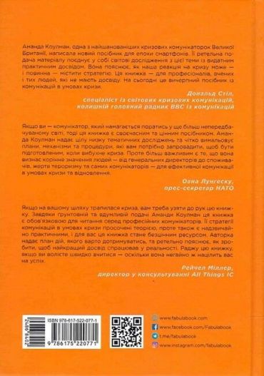 Чи можна підготуватися до кризи? Як захистити репутацію компанії? Чи можна відновитися після подій, які загрожують самому існуванню бізнесу? Видатна британська консультантка Аманда Коулман дає чіткі й переконливі відповіді на ці та чимало інших запитань, що зазвичай хвилюють вдумливих керівників і піарників. Ця актуальна книжка є втіленням більш ніж двадцятирічного досвіду практичної роботи авторки в галузі кризових комунікацій. Цінні поради, наведені результати досліджень і велика кількість конкретних прикладів стануть справжнім ресурсом у повсякденній діяльності професійного комунікатора до настання кризи і на будь-якому її етапі. А продумане планування, своєчасне реагування та постійна увага до людей допоможуть захистити бізнес, зробивши його міцним і стійким до будь-яких викликів.