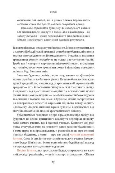 Ця книжка не про буддизм як релігію. Вона про те, як буддійські практики змінюють наш стан і допомагають у бентежні часи. Як переживати втрати й не чіплятися за минуле? Як реагувати на плітки та несправедливість? Чи може регулярна практика зробити нас спокійнішими і доброзичливішими? Як давати раду емоціям? Чому допомога іншим покращує наше самопочуття? Про це й розповідає авторка. Вона пропонує 37 кроків, спроможних змінити наш психологічний стан і ставлення до життя. В основі кожного кроку — буддійська мудрість, підкріплена історіями із власного досвіду та паралелями зі сфер психології, самодопомоги та нейронаук.