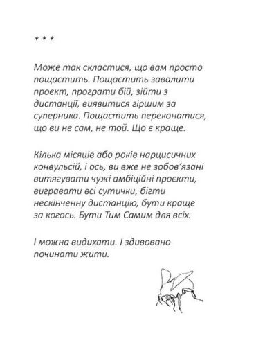 Декілька місяців або років нарцисичних конвульсій – і ось, ви вже не зобовязані витягувати чужі непідйомні проекти, вигравати всі сутички, бігти нескінченну дистанцію, бути краще за когось. Бути тим самим для всіх.