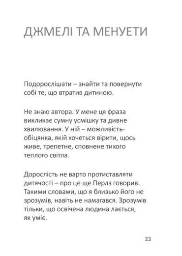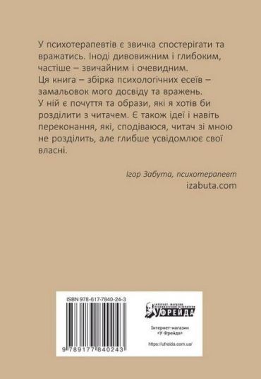 Психотерапія вчить вражатись очевидним, танго — відчувати життя тілом. Ця книга — збірка з 50 психологічних есеїв, написаних не стільки з голови, скільки з серця, з іронією, любов’ю та смутком, «прекрасна єресь» від «танцюючого психотерапевта» Ігоря Забути, автора книг «Обійми мене» та «Танго на кушетці».