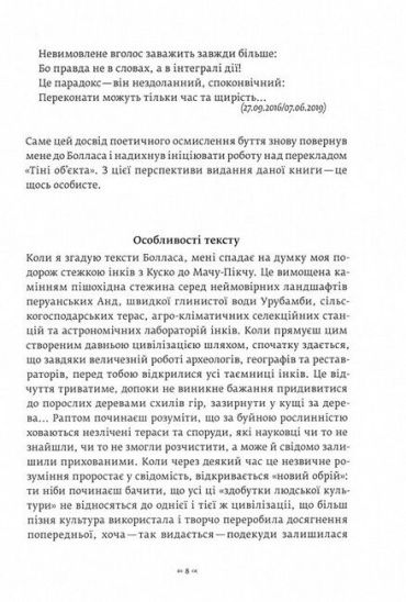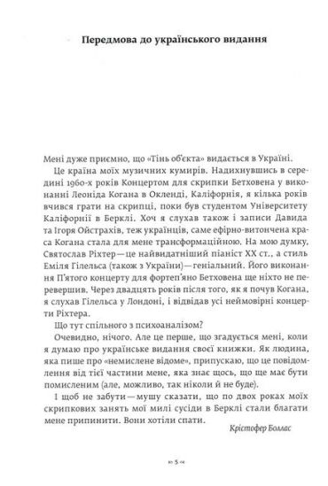“Тінь об’єкта” - вдумлива і надзвичайно естетично написана книжка, яка буде цікавою не лише психоаналітикам та іншим фахівцям з ментального здоров’я (хоча насамперед, звісно ж, їм), але й культурологам, літературознавцям, мистецтвознавцям та будь-якому читачеві, що цікавиться глибинною природою людських думок, дій і переживань. Поєднуючи аспекти Фройдової теорії несвідомого мислення з ідеями Британської школи об’єктних стосунків, Боллас розробляє концепцію немисленого відомого - найранішого буттєвого досвіду взаємодії вродженої структури немовляти з матір’ю-середовищем, сліди якого можна спостерегти в індивідуальних настроях, у миттєвостях естетичного або містичного зачарування, в театрі сновидіння і у ставленні людини до власної самості як до об’єкта. Немислене відоме - це те, що ми завжди “знаємо”, але ніколи не мали нагоди помислити. Психоаналітичний стосунок дозволяє бодай частково це зробити - відкриваючи таким чином можливість трансформації.