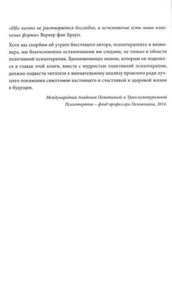 Автор: доктор медицины Носсрат Пезешкиан, специализирующийся в области психиатрии и неврологии, родился в 1933 году в Иране. Школу закончил в Тегеране, изучал медицину во Фрайбурге, Майнце и Франкфурте-на-Майне. Специализировался по психотерапии: учеба в ФРГ, Швейцарии и США. С 1969 года занимается психотерапевтической практикой в Висбадене. Опубликованы следующие его труды: «Психотерапия повседневной жизни», «Торговец и попугай», «Семейная позитивная психотерапия», «Позитивная психотерапия», «33 и одна форма партнерства».