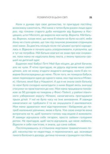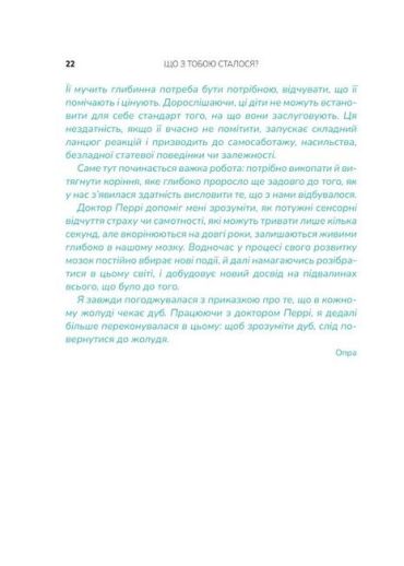 Мати, яка казала: «Ліпше б я зробила аборт». Батько-пияк, що мав важку руку. Вагітна в чотирнадцять, як Опра Вінфрі… від ґвалтівника? Ви сушите голову: «Що зі мною не так?». Натомість поставте собі питання: «Що зі мною сталося?». Глибокий аналіз травм минулого, негативних патернів і спогадів — спільна робота Опри та психіатра Брюса Перрі. Це щира розмова, під час якої ви плакатимете: від болю, що поступово стихатиме, від жахливих спогадів, що стиратимуться з пам’яті, і від щасливого відчуття крил на злеті...