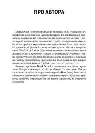 В цій книзі психолог та експертка з відносин Мішель Скін допоможе розібратися, яким чином дитячі переживання відображаються у поточних труднощах у коханні, допоможе усвідомити причини своїх вчинків, навчить пропрацьовувати болісні емоції, підкаже, як звільнитись від страхів. Книга містить надійні інструменти для змін: опитувальники, практичні вправи, когнітивні техніки та медитації, реальні історії зцілення. Авторка надає рекомендації, які працюють, для того, щоб створити теплі, спокійні відносини, що задовольняють.