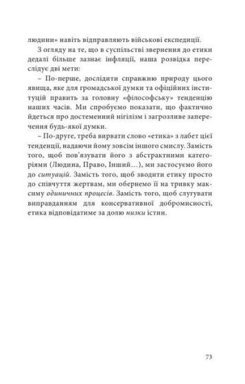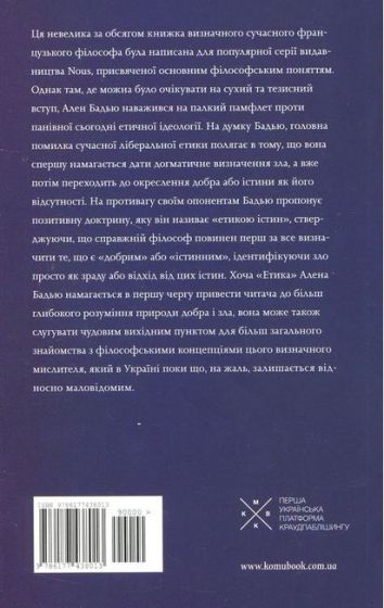 Ця невелика за обсягом книжка визначного сучасного французького філософа була написана для популярної серії видавництва Nous, присвяченої основним філософським поняттям. Однак там, де можна було очікувати на сухий та тезисний вступ, Ален Бадью наважився на палкий памфлет проти панівної сьогодні етичної ідеології. На думку Бадью, головна помилка сучасної ліберальної етики полягає в тому, що вона спершу намагається дати догматичне визначення зла, а вже потім переходить до окреслення добра або істини як його відсутності. На противагу своїм опонентам Бадью пропонує позитивну доктрину, яку він називає "етикою істин", стверджуючи, що справжній філософ повинен перш за все визначити те, що є "добрим" або "істинним", ідентифікуючи зло просто як зраду або відхід від цих істин.