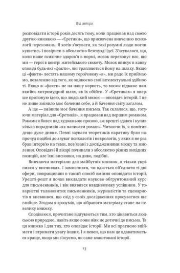 Ця книжка глибша за ті посібники зі сторітелінгу, які ви бачили раніше. Ви навчитеся захопливо писати й утримувати увагу читача. Крім цього, дізнаєтеся про прийоми відомих письменників та роботу мозку — своєрідного цеху зі створення історій.