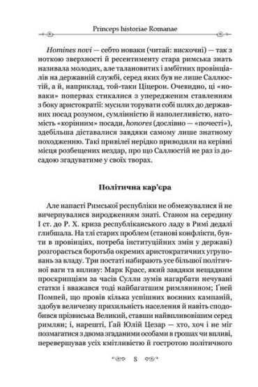 Ґай Саллюстій Крісп (бл. 86 р. до Р. Х. — бл. 35 р. до Р. Х.) — чільний римський історіограф, видатний стиліст, реформатор жанру. Тонкий психолог і майстер підозри, Саллюстій захоплював і надихав своїми творами не одне покоління європейських істориків, письменників та філософів — від Таціта до Момзена, від Сенеки до Ніцше. «Змова Катіліни» — дебютна монографія автора, присвячена подіям 63 р. до Р. Х., коли збіднілий патрицій Луцій Серґій Катіліна спробував учинити в Римі збройний переворот і захопити державну владу.