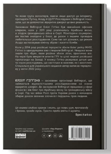 Коли у 2014 році росіяни збили боїнг рейсу MH17, Гіґґінз з однодумцями вже створили Bellingcat. Невдовзі вони знали про «Бук», яким збили літак, майже все. На черзі було викриття агентів ГРУ та мережі російських пропагандистів на Заході. У цій майже детективній історії Гіґґінз описує деталі багатьох розслідувань, що відкрили світові правду і кинули виклик тим, хто заперечує дійсність задля власної вигоди.