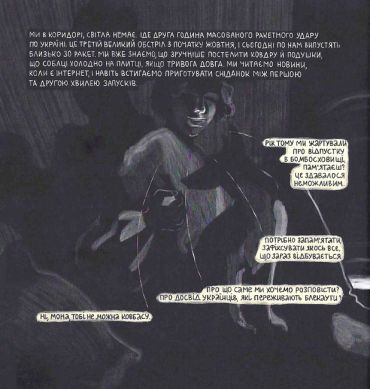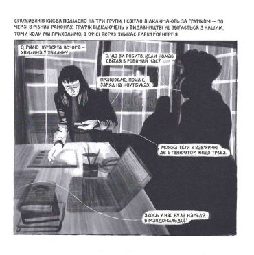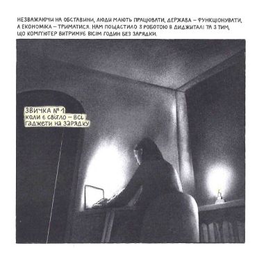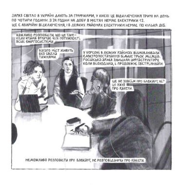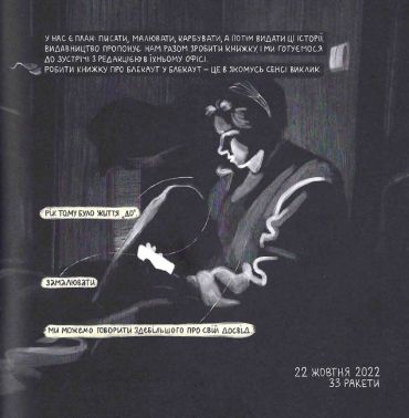 Десятого жовтня 2022 року відбувся перший масований обстріл енергетичної інфраструктури України, і з того моменту в словнику всієї країни з'явилося слово «блекаут». Упродовж місяців життя під атаками російських ракет ми виробляємо нові звички, пристосовуємося до нових умов, опановуємо нові прилади. Ми вимушені організовувати щоденні справи, керуючись графіками відключення світла, а горизонт планування сильно скоротився. Блекаут — це не лише темрява вдома: це відсутність води, неможливість працювати, небезпека для водіїв, пішоходів і домашніх тварин на темних вулицях, рослини, що замерзають в оранжереї, відсутність будь-якого зв'язку. А ще це історія про українців, які різними способами мужньо вчаться його долати.
