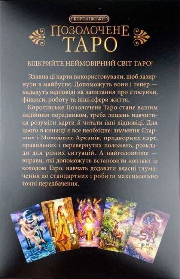 Королівське Позолочене Таро стане вашим надійним порадником, треба тільки навчитися правильно ставити картам запитання й читати відповіді. Усе необхідне для цього є в книжці: значення Старших і Молодших Арканів, придворних карт, прямих і перегорнутих положень, розклади для різних ситуацій. А найголовніше — вправи, які допоможуть встановити контакт зі своєю колодою Таро, додати власні тлумачення до стандартних і давати максимально точні передбачення.