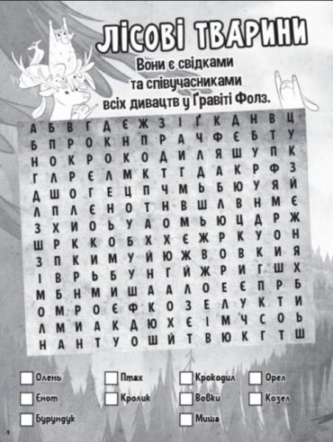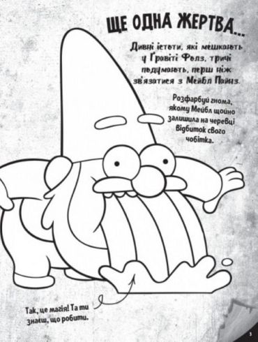 Цікаво, що приховує ця книжка? Авжеж загадкові пригоди близнюків Діппера та Мейбл і їхніх друзів. На сторінках безліч головоломок, розфарбовок й, звичайно, таємниць. Приготуйтеся вирушати у цікаву подорож разом із улюбленими персонажами Ґравіті Фолз!