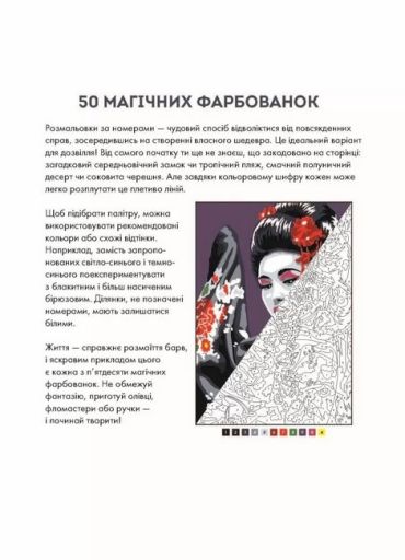 Відвідати середньовічний замок чи прогулятися лавандовим полем? Пограти в теніс чи зайнятися віндсерфінгом? Обирай одну з 50 цифрових розмальовок, яка відповідає твоєму настрою, і релаксуй! За допомогою кольорового шифру ти зможеш створити яскраві пейзажі, соковиті натюрморти і навіть портрети.