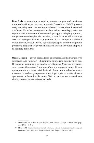 У цій відвертій і захопливій книжці один із найдинамічніших і найвідоміших артистів сьогодення розповідає про свій шлях до успіху, щастя та внутрішньої гармонії — про те, як звичайний хлопець Вілл Сміт із Західної Філадельфії перетворився на одну з найяскравіших зірок спершу на музичному небосхилі, а потім і в кіноіндустрії. Утім ця епічна історія має й зворотний бік: ставши одним із найкасовіших акторів сучасності, Вілл Сміт був переконаний, що його безпрецедентний успіх зробить щасливим не лише його, а й усіх навколо нього. Та не так сталося, як гадалося. Підписавшись на життя, якого навіть не бажали, близькі Вілла почувалися не родиною, а артистами на арені його яскравого голлівудського цирку. Виявилося, Віллові Сміту ще багато чому слід навчитися. Особиста подорож актора до глибин самопізнання й усвідомленості вилилася на сторінки цих дивовижних мемуарів, які написано в тандемі з Марком Менсоном, автором бестселера «Витончене мистецтво забивати на все». «Вілл» — це щира сповідь про шлях до опанування власними емоціями, що допоможе кожному читачеві ліпше зрозуміти самого себе та свій внутрішній світ. Мало кому з нас відомо, якого тиску зазнають голлівудські знаменитості, коли їхнє життя стає надбанням громадськості, однак кожен із нас має збагнути, що паливо, яке живить тебе на одному етапі твого життя, може виявитися абсолютно недієвим на наступному. Поєднання глибокої мудрості, цінних порад і захопливого стилю робить цю книжку, як і її автора, унікальними у своїй категорії.