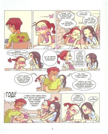 Подружки-торохтушки хихочуть у кутку. Вони завжди мають, що обговорювати: то плечі однокласника, які раптово стали широкими, то власну недосконалість – підліткові прищі, груди, які все ніяк не виростуть… то нав’язливі знаки уваги, то відвертий бешкет. Разом вони – непереможна команда, з якою не варто задиратись, адже стоять одна за одну горою.