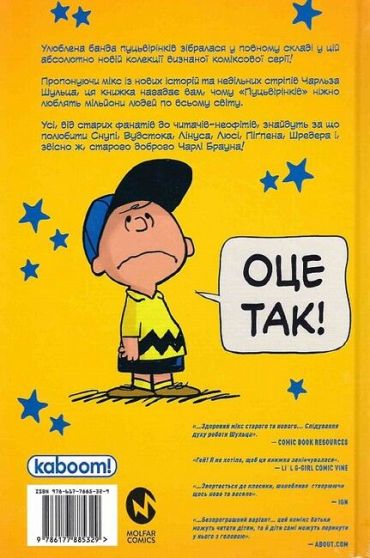 Улюблена банда пуцьвірінків зібралася у повному складі у цій новій колекції визнаної коміксової серії! Пропонуючи мікс із нових історій та недільних стріпів Чарльза Шульці, ця книжка нагадає вам, чому “Пуцьвірінки” ніжно люблять мільйони людей по всьому світу. Усі, від старих фанатів до но вих читачів знайдуть за що полюбити Снупі, Вудстока, Лінуса, Люсі і, звісно ж, старого друга Чарлі Брауна.